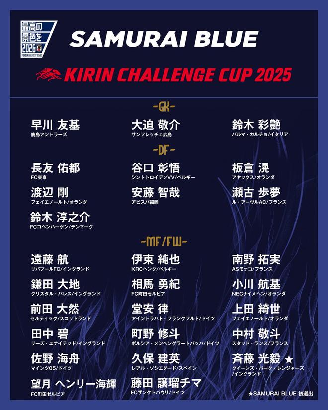 10月2日,北京时间,日本足球协会在10月份正式宣布了日本国家队的主要名单,由Endo领导,Misato Kaoru缺席,并选择了Keito Nakamura。日本将分别在10月与巴西和巴拉圭比赛。日本十月的守门员:Tomoki Hayakawa(Kashima Antlers),Keisuke Oma(Hiroshima三箭),Aiyan Suzuki(Parma)Defenders:Yuto Nagato(fc Tokyo) Aiko Seko(Le Havre),铃木(哥本哈根)中场球员:Kotoko Endo(利物浦),Junya It(Genk),Takumi Minami(Monaco),Dadi Kamada(Mi Azumiya) UEDA KISE(Feyenoord),田中BI(利兹联),Sutho Machino(Monchengladbach),Keito Nakamura(Lance)(Lance),Kento Sano(Mainz),Keneyo Ranger),Hiroshiki(Machida Zevia)(Machida Zevia),Jeongruchima(Jeongruchima(Sao Paulo)(Sao Paulo)