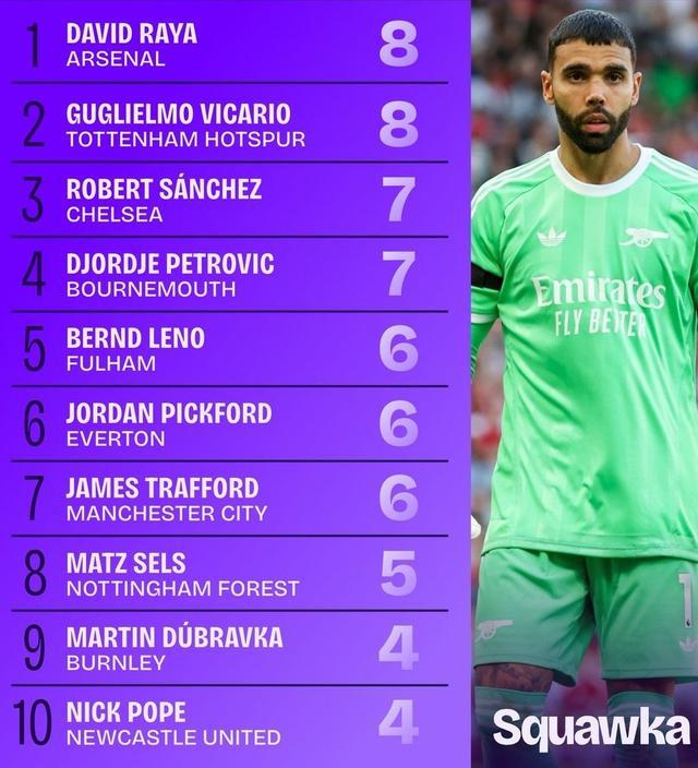 根据Squawka的统计,在8月28日,在2025/26时期的前两个树枝上,北京时代,阿森纳的守门员戴维·雷亚(David Raya)和托特纳姆·守门员维卡里奥(Vicario)以8次扑救并列最高,他们都失去了一个目标。 David Raya (Arsenal) 8 Times Vicario (Tottenham) 8 Times Robert Sanchez (Chelsea) 7 Times Petrovic (BorneMouth) 7 Times Leno (Fulham) 6 Times Pickford (Element) 6 Times Trafford (Manchester City) 6 Times Zeles (Nottingham Forest) 5 times (Newcastle United) 4 times [Exclusive view of The Premier League on League Oning Oning On League on League on League on League on League on联盟。 Migu]